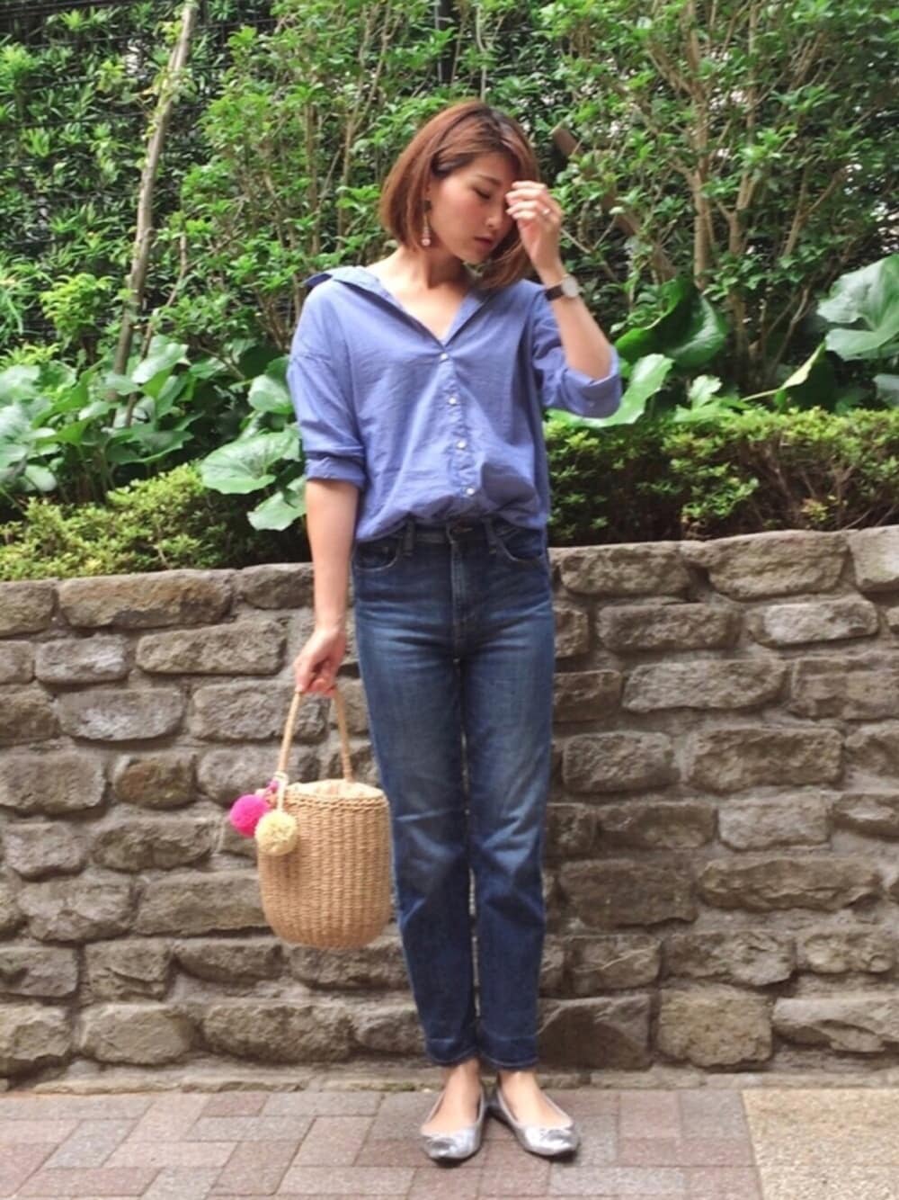 前postと間違い探しみたい🤣 午後はトート→かごバッグ、パンプス→バレエシューズに変えてお出かけ✨ シャツボタンを午前より一つ多く外して抜きえりで着ました😊 ペタンコでも女っぽく😜💕