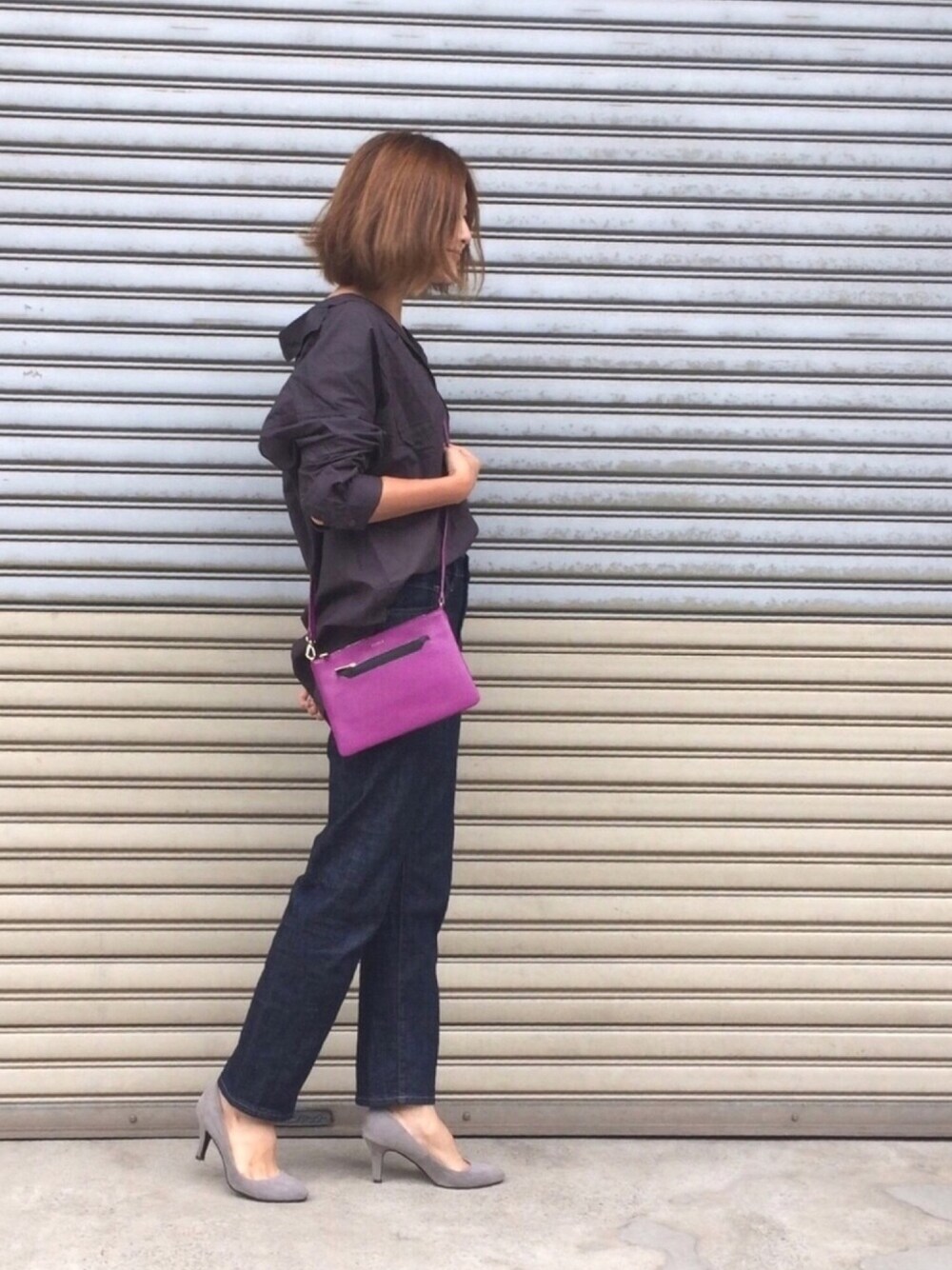 バッグを差し色にした大人カジュアルコーデ😊 シャツはsaleで800円弱、デニムは昨年UNIQLOの値下げで1300円くらいだったやつ👚👖 パンプスをグレーにしたらキレイめにまとまりました🙆