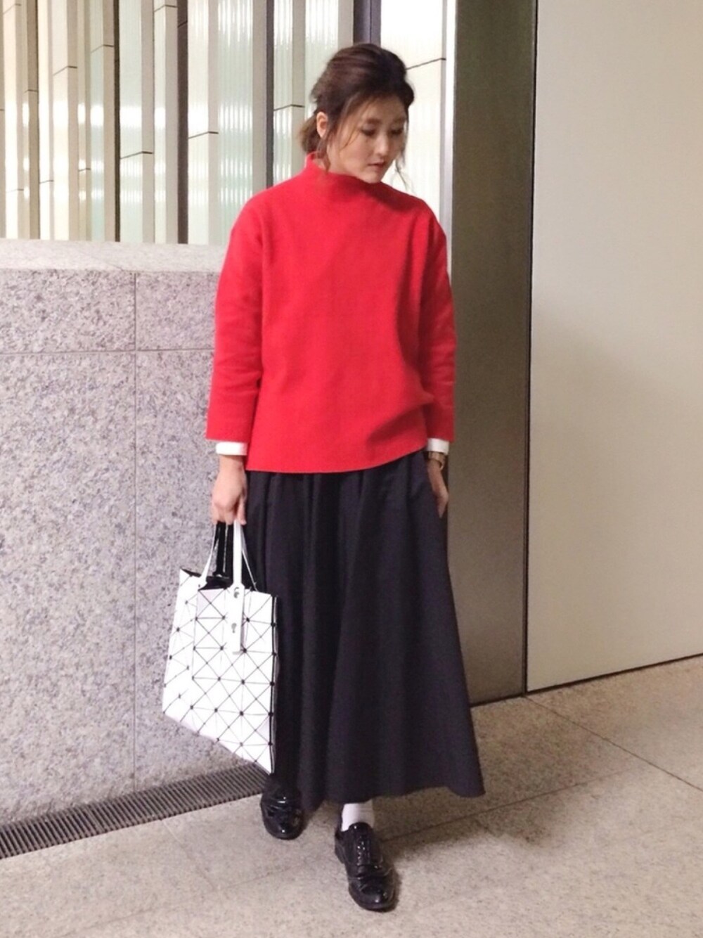 赤×黒×白🔴⚫️⚪️ ニットの下に白シャツを着ています👔 襟立ててちょい見せしたらよかったかな?🤔 ニットはインせず、ゆるっと😊