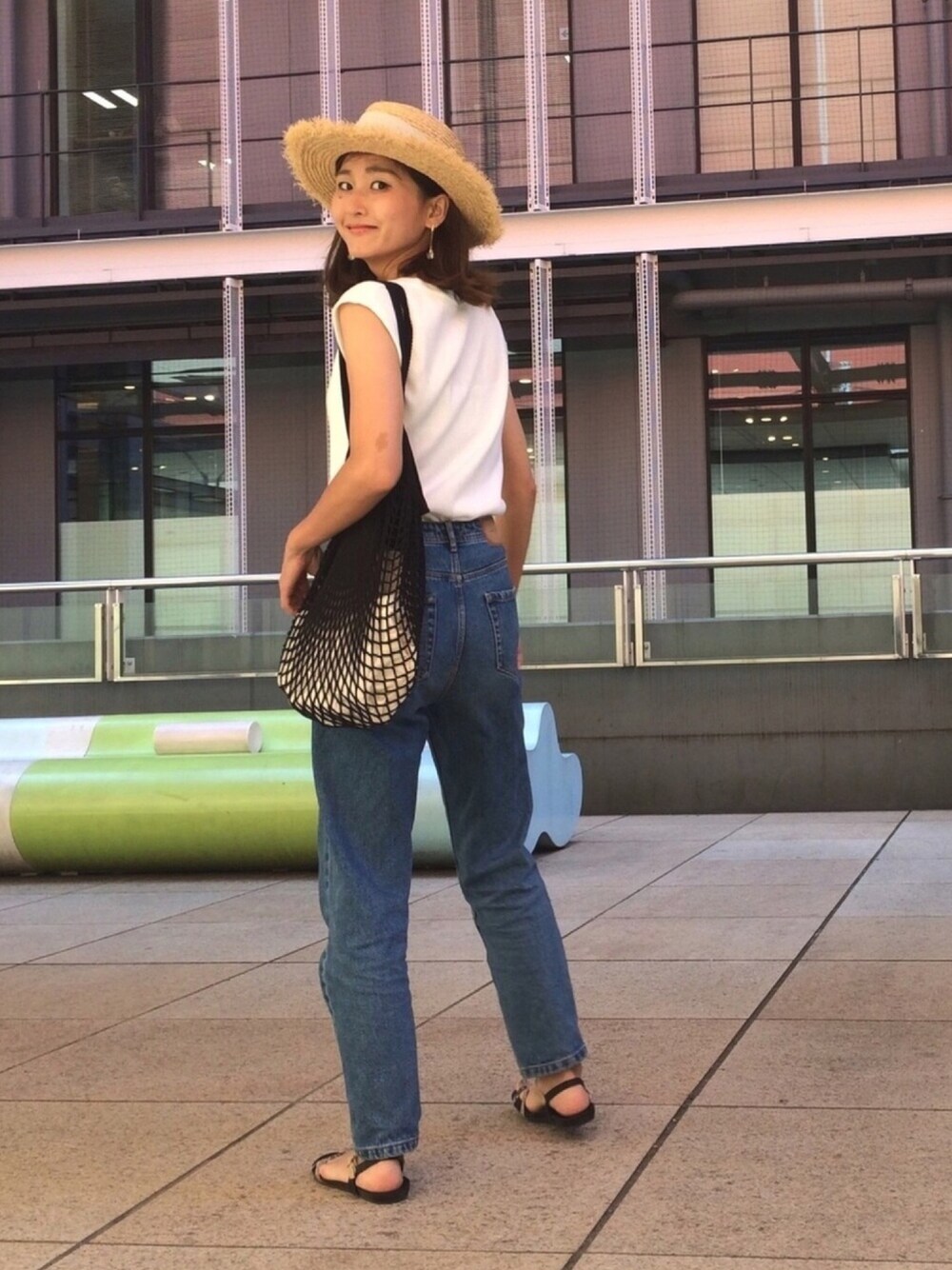 トップスはまたまた GUのワッフルスリーブレスT👚 デニムはZARAのマムジーンズ👖 生まれつきある腕のアザは、子どもたちからは、チーズ蒸しケーキと呼ばれています🧀 (ヤマザキの北海道チーズ蒸しケーキの色?柄?に似ているから😂)