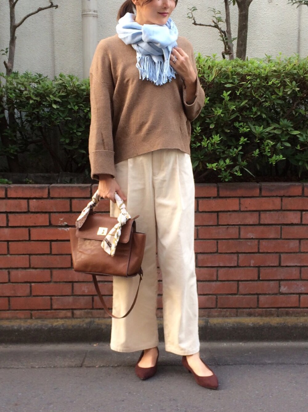 ブラウン×ホワイト ペールブルーのストールで秋色コーデを爽やかに🧣