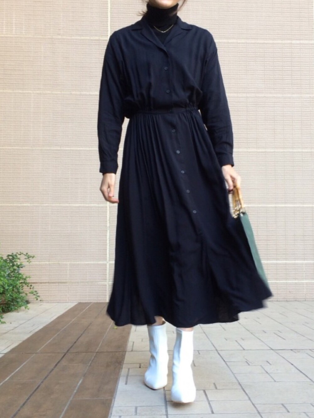 開襟シャツワンピースにタートルネックニットをin🧶 白ブーツおしゃれ感出る✨ ストレッチブーツなので、脱ぎ履きしやすいのも🙆♀️