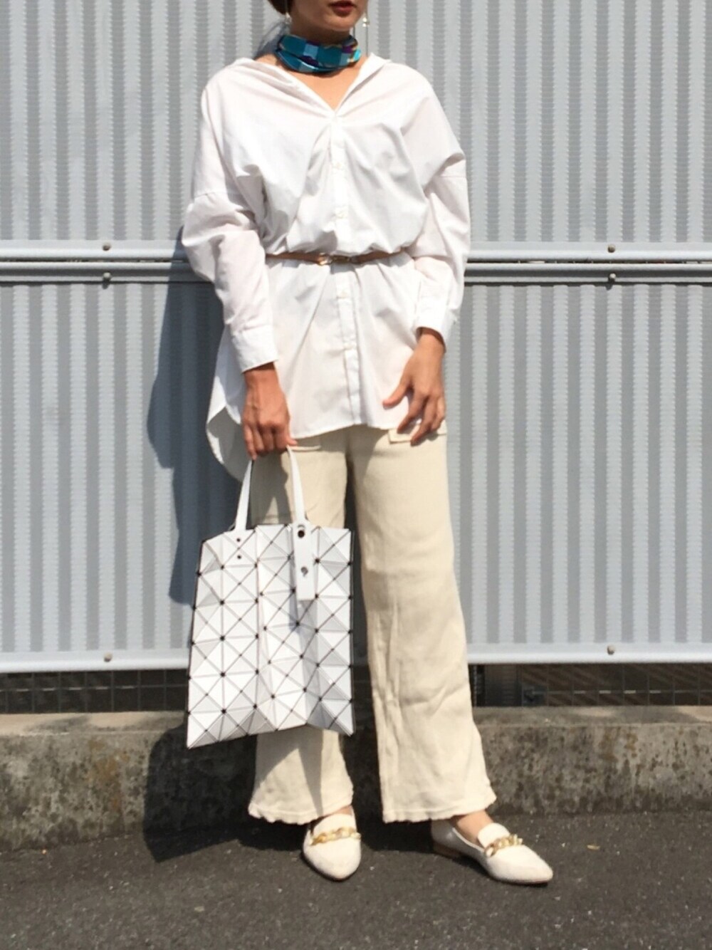 ホワイトコーデにスカーフを効かせて🧣 👖→GU リブスリットワイドパンツ