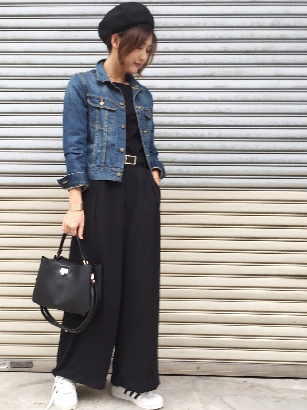 今日はブラックコーデ! 初めMA-1を着ていたけどいまいちしっくりこずGジャンに変更したらいい感じ✨ 自己満だけどお気に入りです😁👍 このワイドパンツはいつも素敵なsoliさんとお揃い❤️ スカンツみたいなたっぷりしたボリュームが最高😍💕落ち感のある生地なのできれいめにも◎ バッグも小ぶりな見た目以上に収納力がありとても使いやすいです👜✨ ベレー帽は髪の毛を下の方でお団子にして、そこにひっかけるようにかぶりました👒