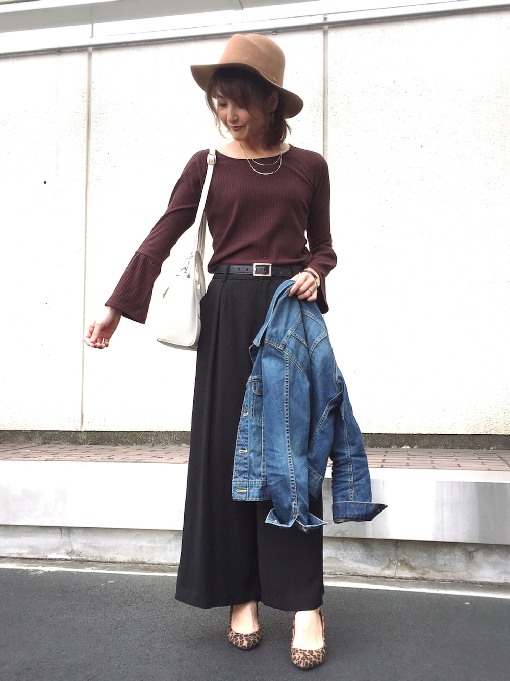 ブラウン×ブラック。 トップスは肘下あたりから広がるベルスリーブになっています💕 それを見せたくてこんなポーズに😂 リブと適度なフィット感で腕が細く見える気がする✨