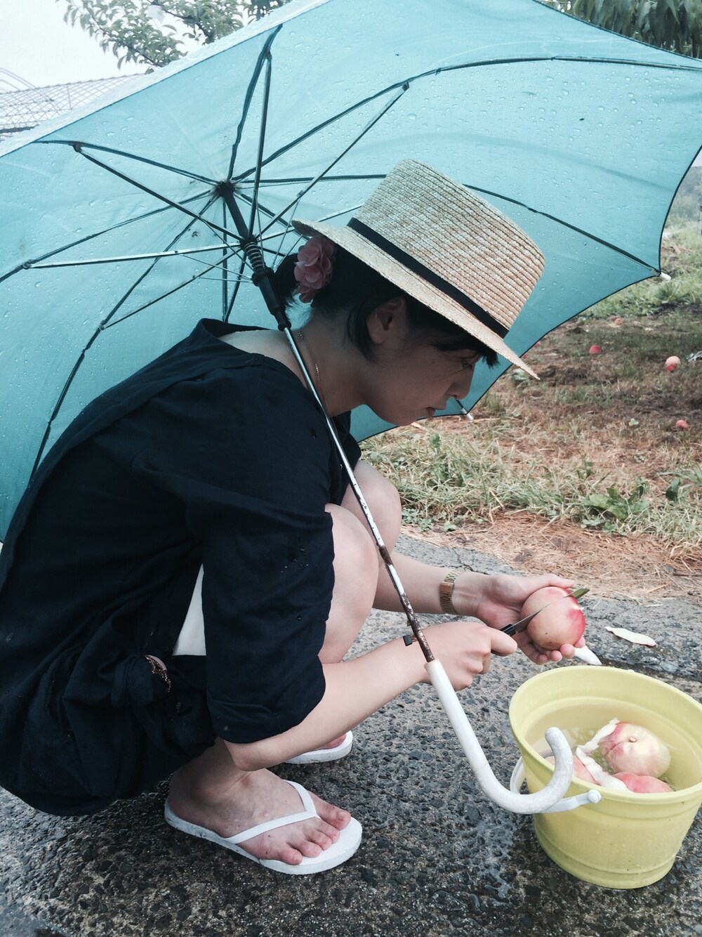 にこあんど の綿のドレスワンピ。 帽子はその辺の雑貨屋で買いました。 ビーサンはオールドネイビー 腕時計はお姉ちゃんのCASIOの金色のやつ 土砂降りの中の桃狩り