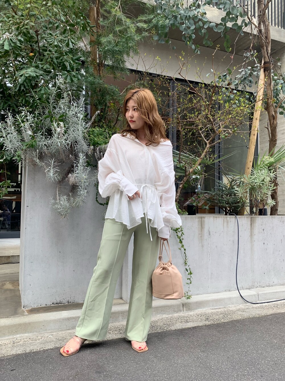 カラーパンツを大人っぽく着たかった日🌿 ウエストマークすることで、ボリュームのあるブラウスもスッキリ着られます!