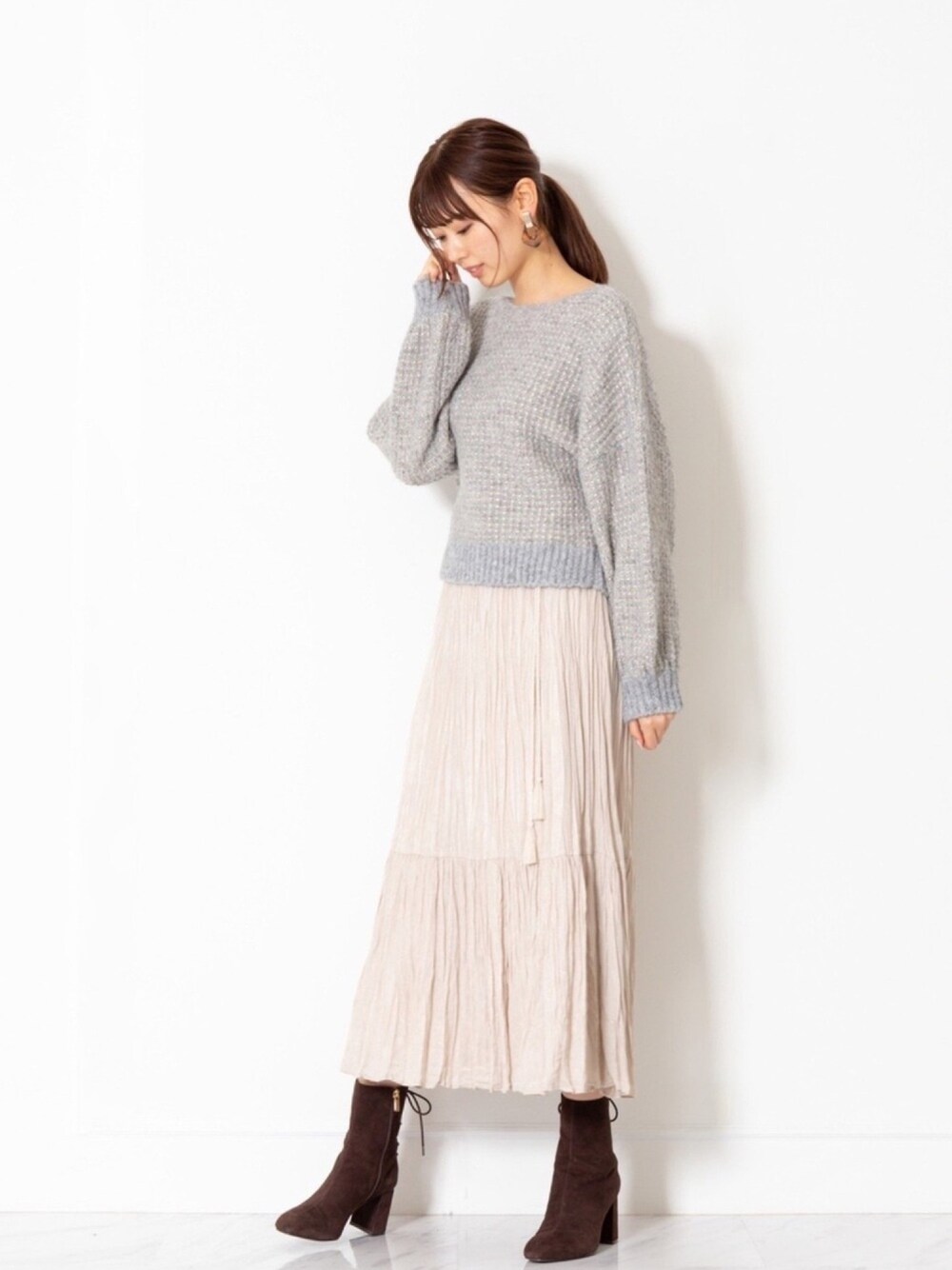 ヴィンテージサテンを使用した、今までにないシワ加工のようなプリーツスカートはカジュアルな印象なので、ニット合わせで女性らしさを出すのがオススメです。