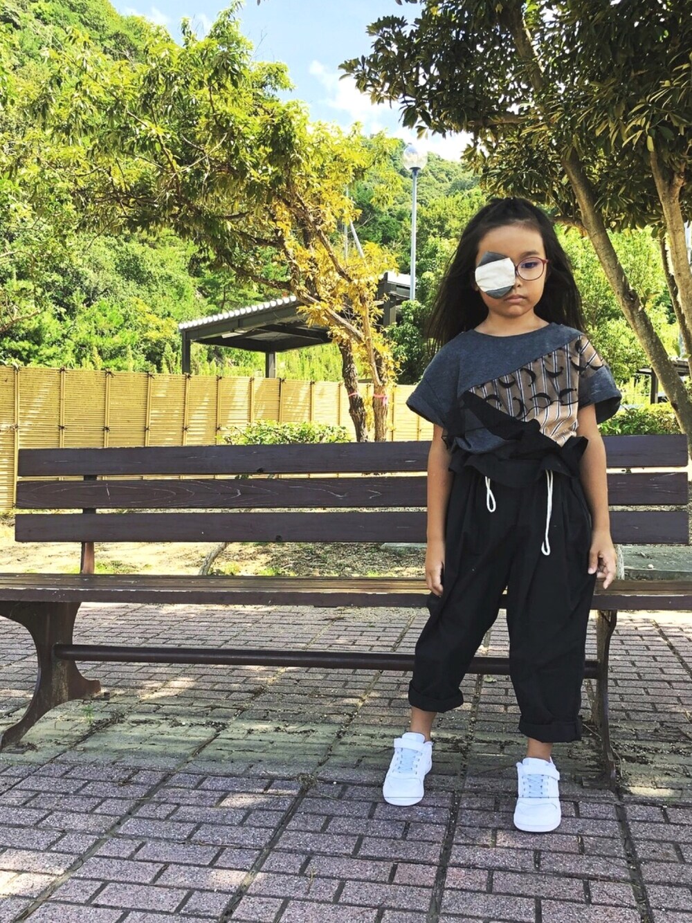 👧🏻さん弱視のため アイパッチをしてトレーニングをしてます💦 まだまだ暑いけど秋コーデ🌞