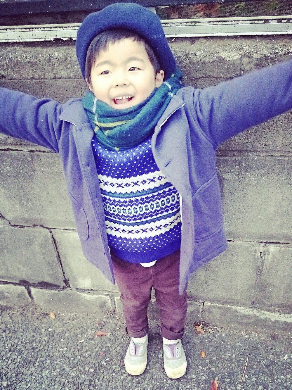 ママのベレー帽がかぶりたい!!とうるさいので私のベレーをかぶせてみました^^ ネイビー多すぎコーデになっちゃったけど本人ニコニコなので良し〜❤