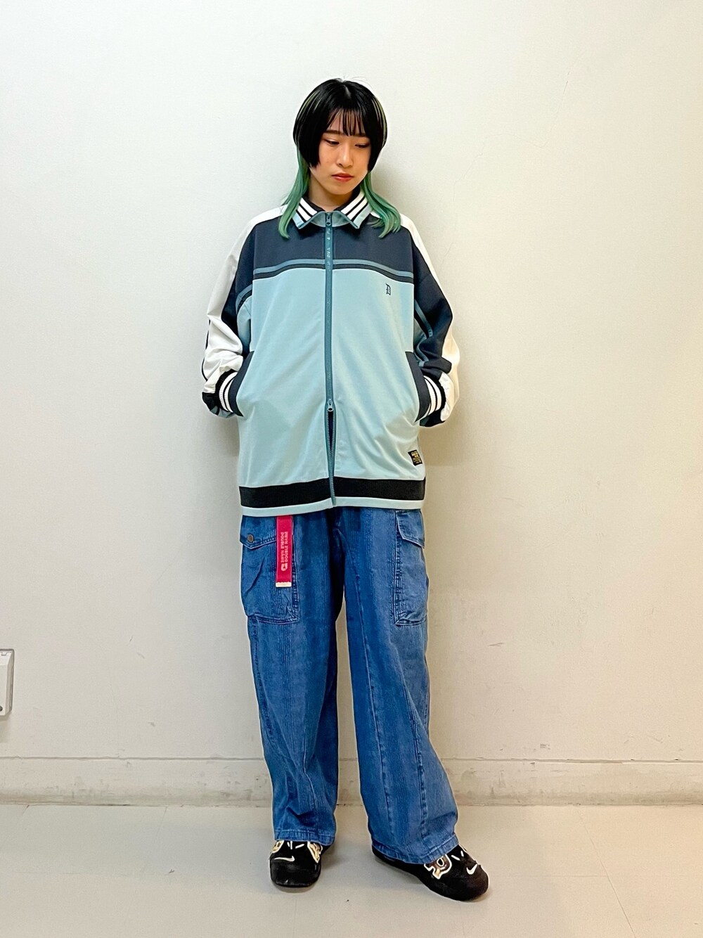 トレンドのトラックジャケットをカーゴデニムでラフに、カジュアルに合わせました! ブルートーンにピンクのベルトがアクセントです❤️🔥