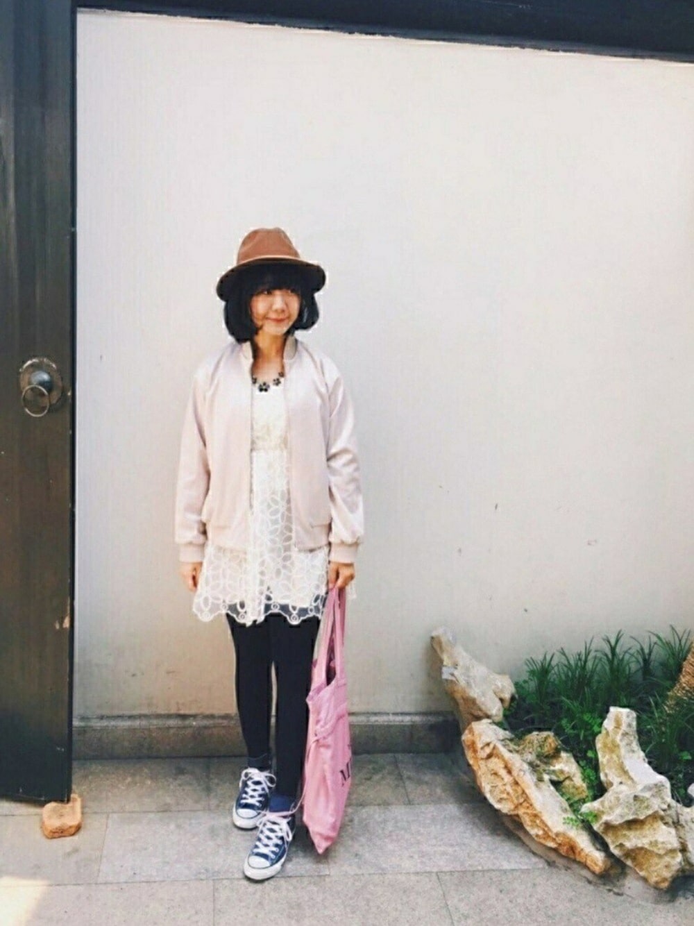 コンバースで大学時代に戻る気分かな? シルバーのブルゾンとピンクの巾着はどっちも最近気に入った買い物 素材にこだわるミラーのブルゾン 着まわし力高いシルバをチョイス 巾着バッグの収納力は優秀すぎて差し色として休日コーデに投入してみた