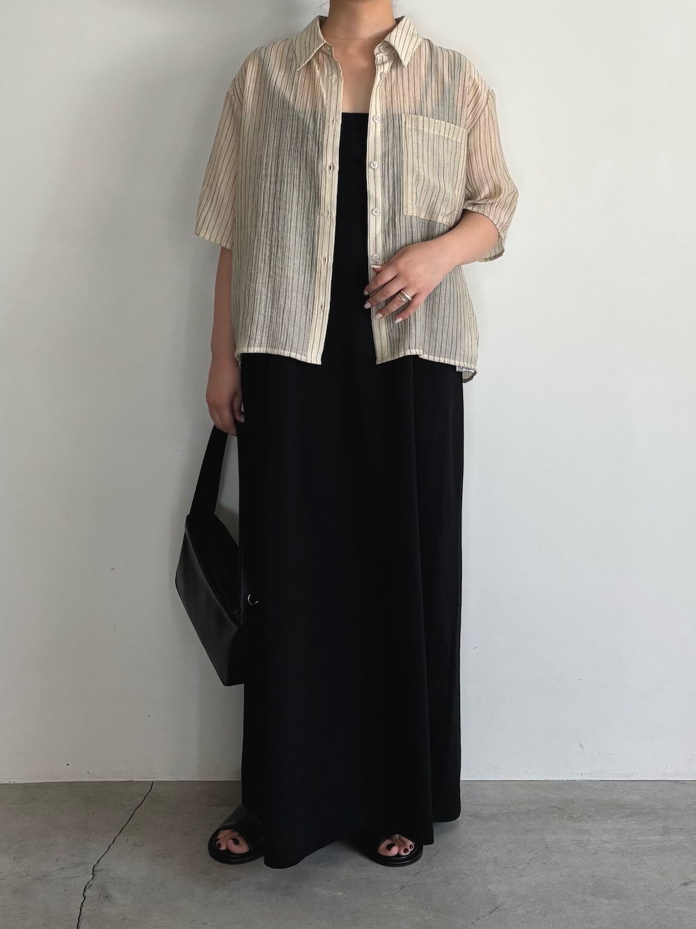 157cm/イエベ秋 【普段の着用サイズ】 トップス:M ボトム:M〜L なるべく二の腕と足を出したくない人です。 【tops】 シアーストライプショートシャツ 着用カラー:ベージュ ボックスシルエットのシアーシャツです。 ストライプが夏らしくて可愛い。 福岡は気温35℃ですが、真夏日にも着やすい素材感です! 今日は前ボタンをあけて羽織にして着用しています。 【dress】 2wayカットジョーゼットキャミワンピース 着用カラー:ブラック 着用サイズ:Lサイズ 前後2wayのキャミワンピースです。 ジョーゼット素材なので、しわになりにくくサラッとした着心地です! 身体のラインを拾わず裾に向かってやや広がる綺麗なシルエットです。 生地が肌に張り付かず真夏日にも着用しやすいと思います!