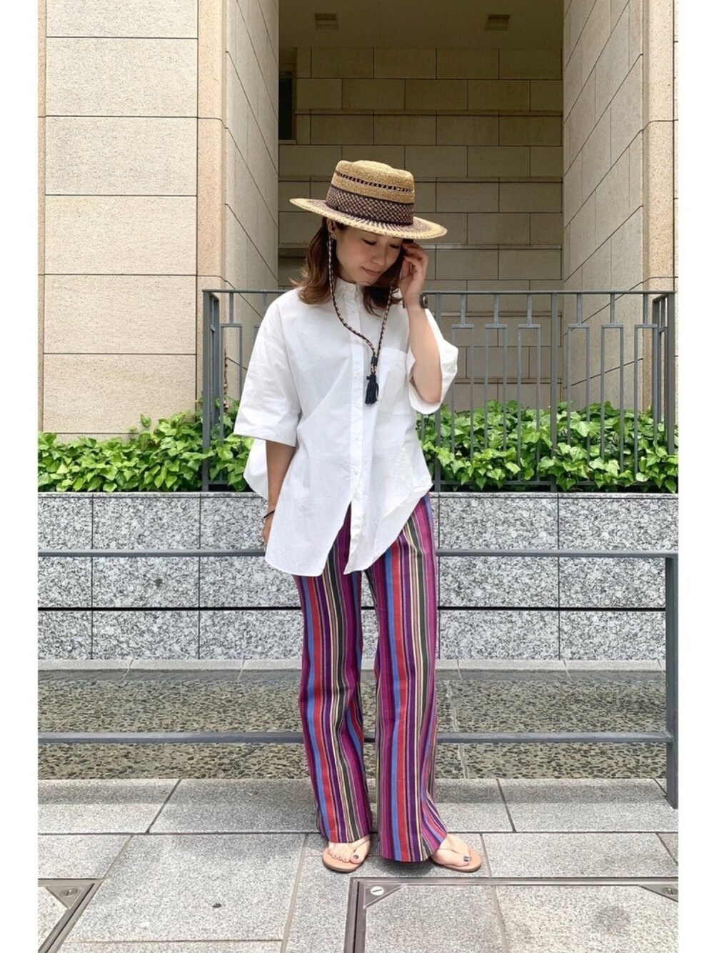 ストライプが気分な最近。 シャツのキレイさを活かしながらパンツに合わせた夏ハット◎ タッセル付きあご紐がポイントです!