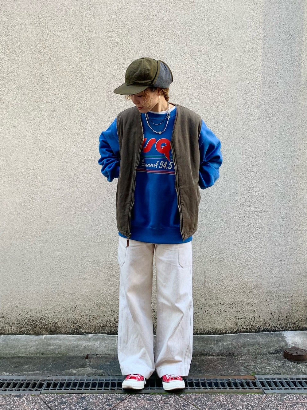 【item】撥水加工を施したナイロンタッサーを表側に使用したドッグイヤーキャップ。 耳あて部分を下げて防寒対策にも。 洗濯機洗いOK👌🏻 【size】59cm(サイズ調整可能) 【code】カラフルなスウェットをアクセントに、ベストと キャップはカーキで合わせました。