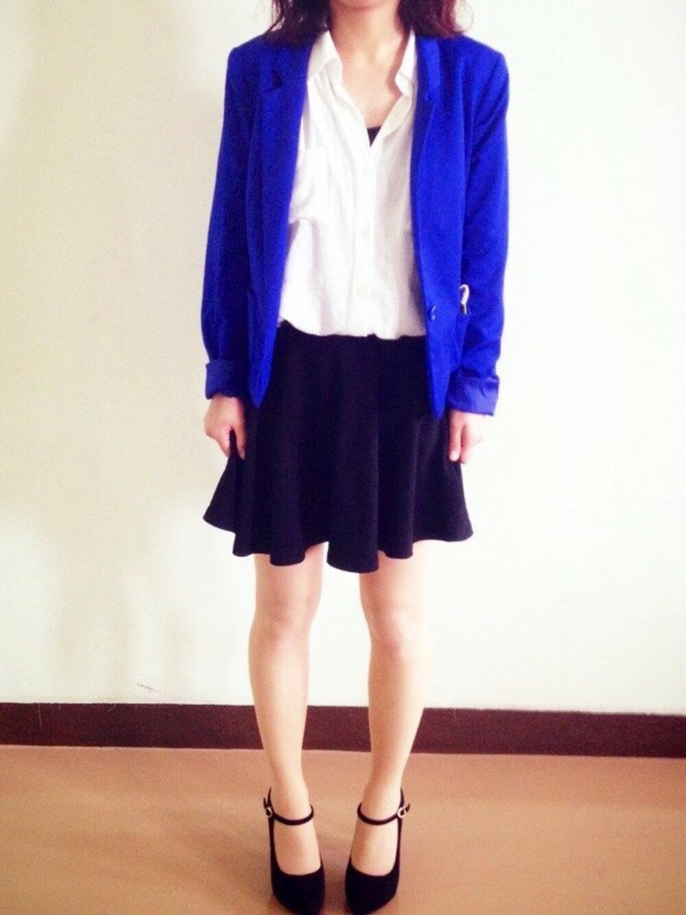 青のテーラードジャケットで華やかに(^○^) シンプルにまとめてみました(^○^) H&M 青のテーラードジャケット Bershka スカート 白シャツ