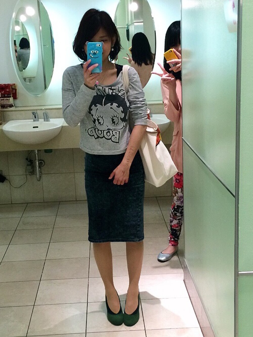 デニムのペンシルスカートとスウェット生地のトップスでカジュアル大人っぽくしてみました(^○^) 芝生色のパンプスがおちゃめです(笑) 今日のポイントは腕です(笑) 大学で遊んだ感がでてます(笑) スウェット生地のトップス Bershka ペンシルスカート Bershka パンプス w♡c
