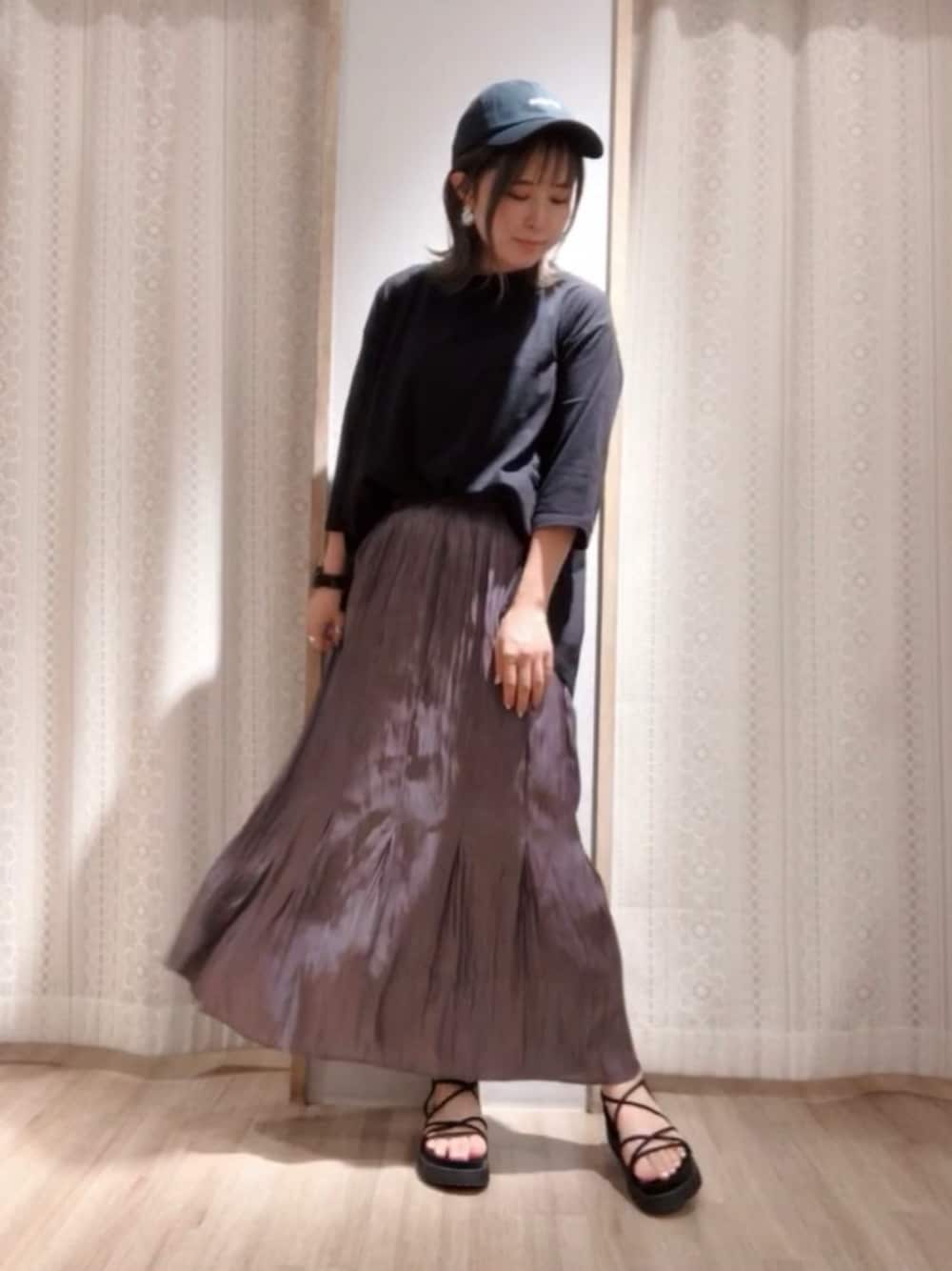 サテンスカートが今年っぽいです◎ ロング丈なので160cm台の方でもロングスカートとして履けちゃいます(^ω^)
