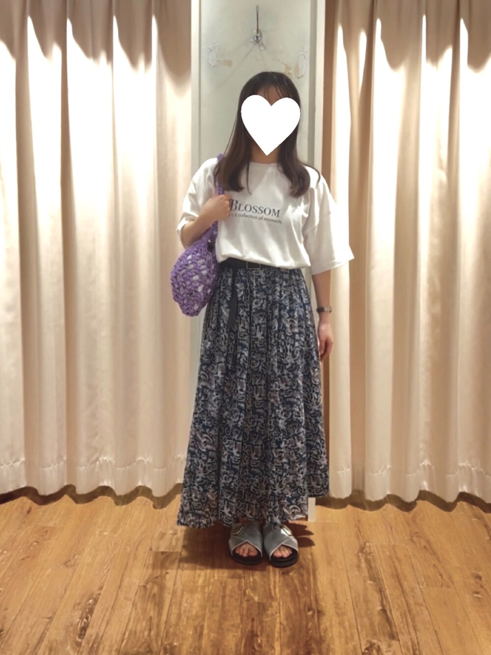 風通しのボイルギャザースカートにロゴ を合わせて、冷感のある大人カジュアルスタイルに!