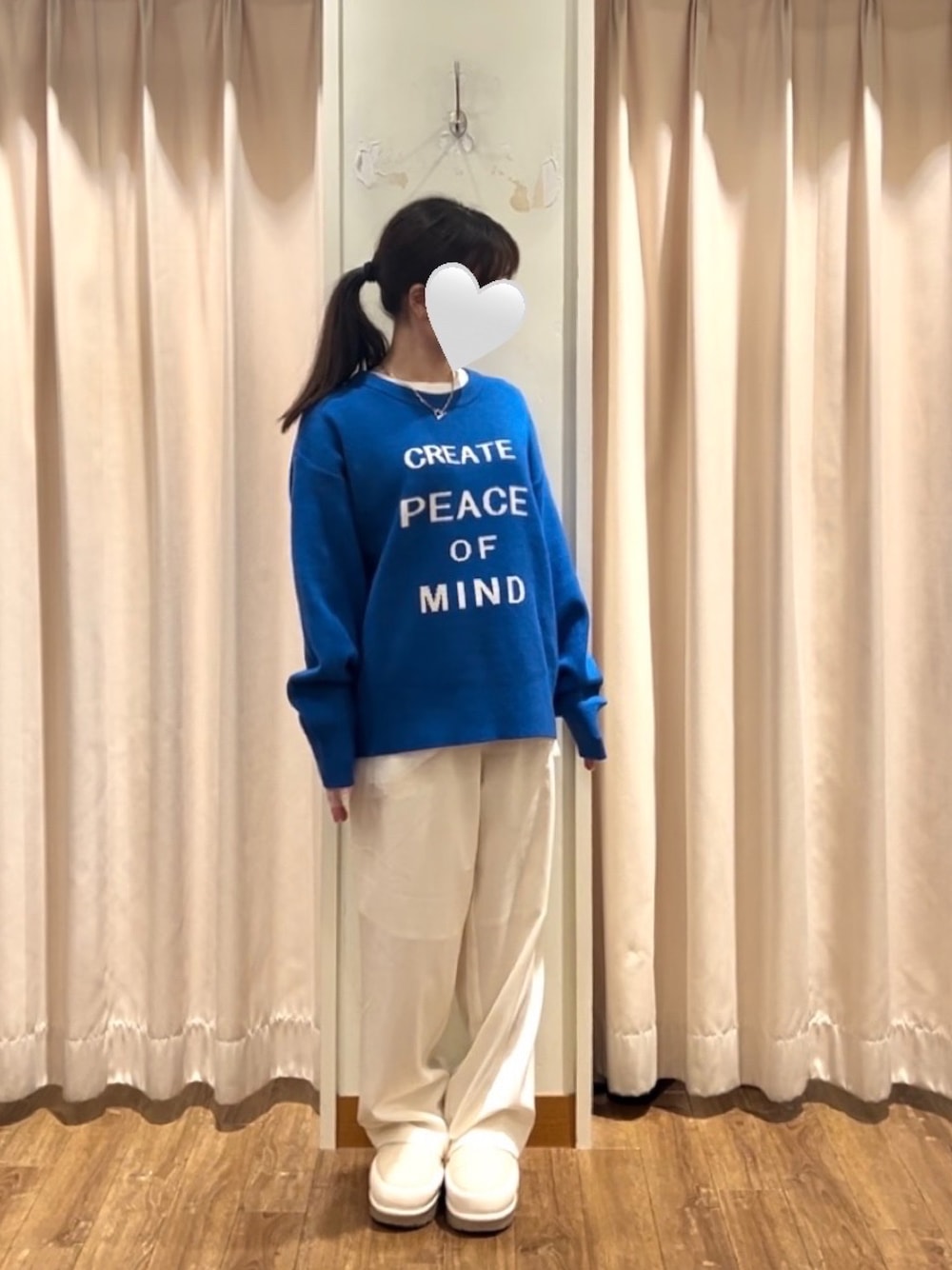 キレイな青が映えるように、全身白に統一しました。トップスはモチモチしていて、着心地が良かったです!Hug knitシリーズたくさん販売しています🧶 着用アイテム 【Hug Knit】ロゴプルオーバー