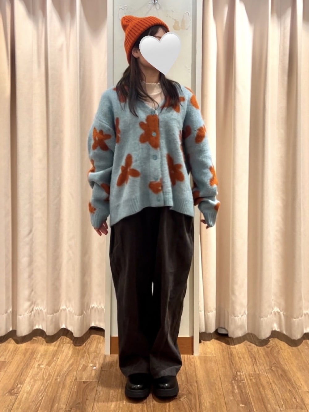 大きな花柄が目を惹くカーディガンを着用しました。サックスブルーとオレンジの組み合わせがかわいいです🩵 全て前回と投稿と色違いのアイテムを使用しています。