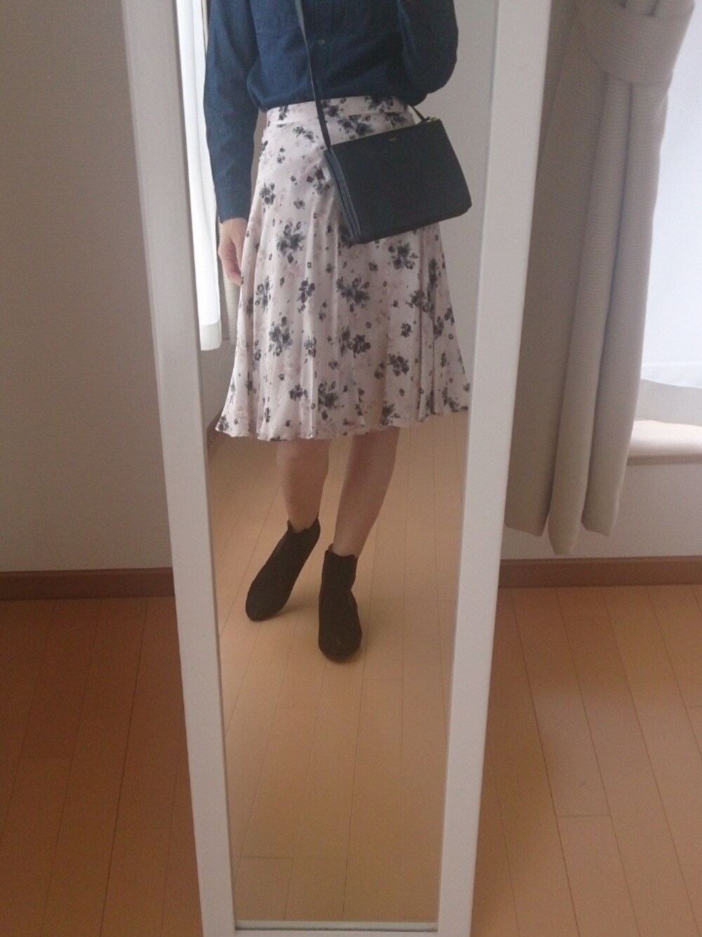 リーファーの新作スカートで早速のコーデその1 スモーキーなピンクの花柄。。あえてのデニムシャツやライダースなんかと合わせてみたり♡ 足元はサイドゴアで秋っぽく♡
