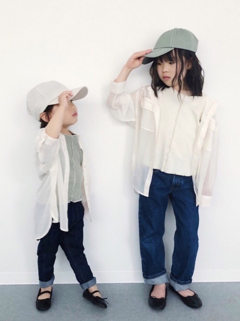 白とミントとデニム〜♪♪ 2人一緒に撮る難しさったら…笑 次女はやっぱりお姉ちゃんの真似っこ♡ いつも見て頂きありがとうございます😊