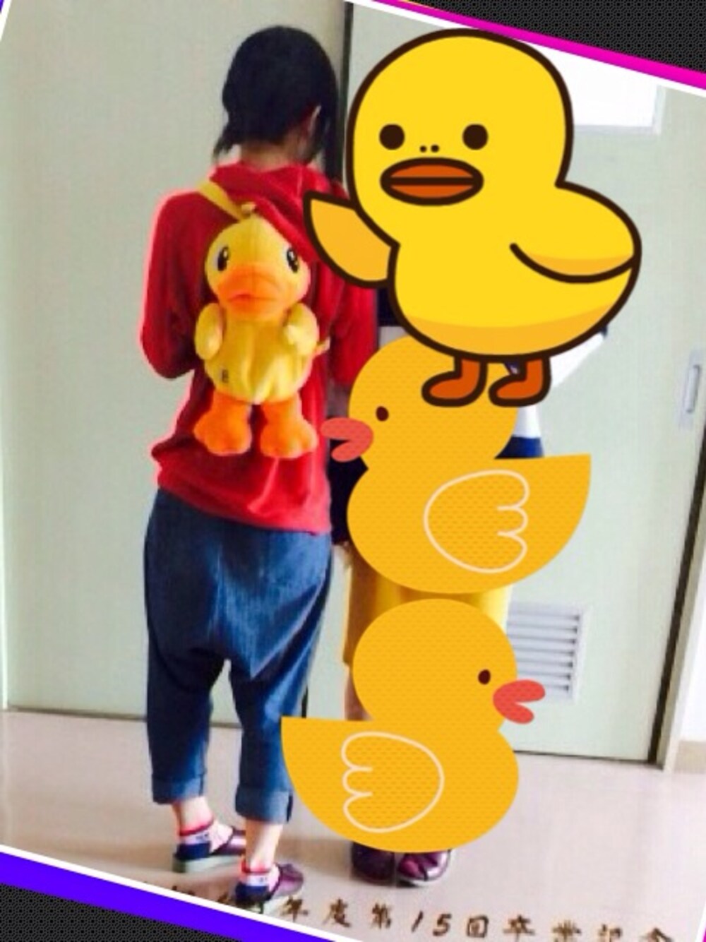 3日まえぐらいのコーデです🙌 パーカー大好きなので秋、冬はフル活用してます。 デニムパンツはサルエルになっていてゆったり着れます。 私服高校なので毎日が大変…。 背中のアヒルはサンキューマートで購入😆💕 普段はあめちゃん入れになってます