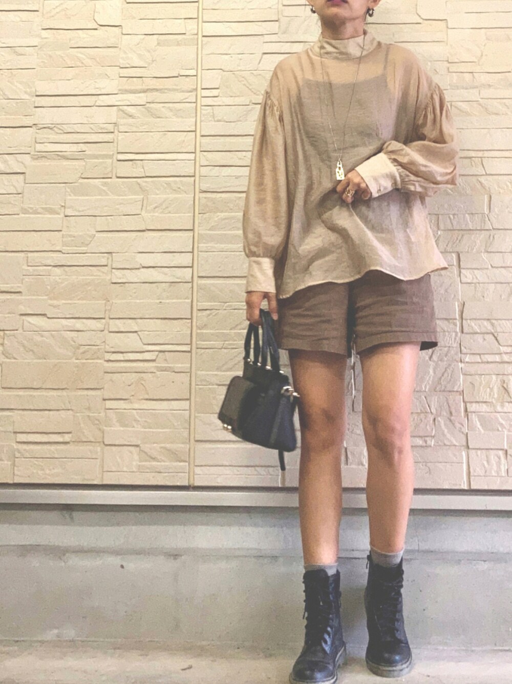 AKARIのシャツ/ブラウス「スタンドカラーシアーブラウス」を使ったコーディネート