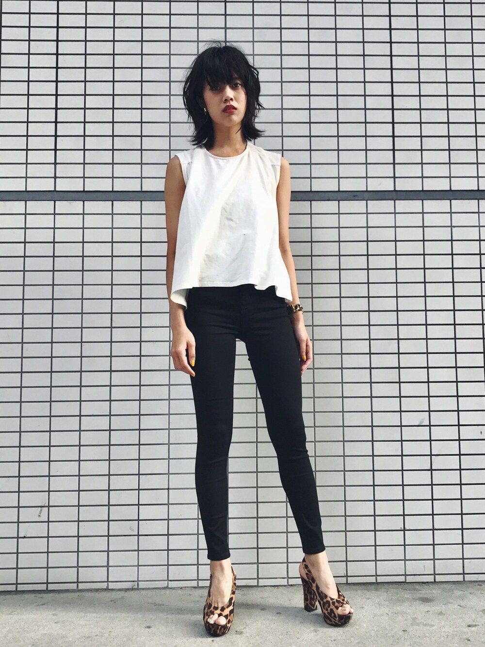安定のシンプルコーディネート!! 可愛いデザインのトップスに あえて、ブラックのパンツと レオパード柄でカッコよく 着こなしたい♪