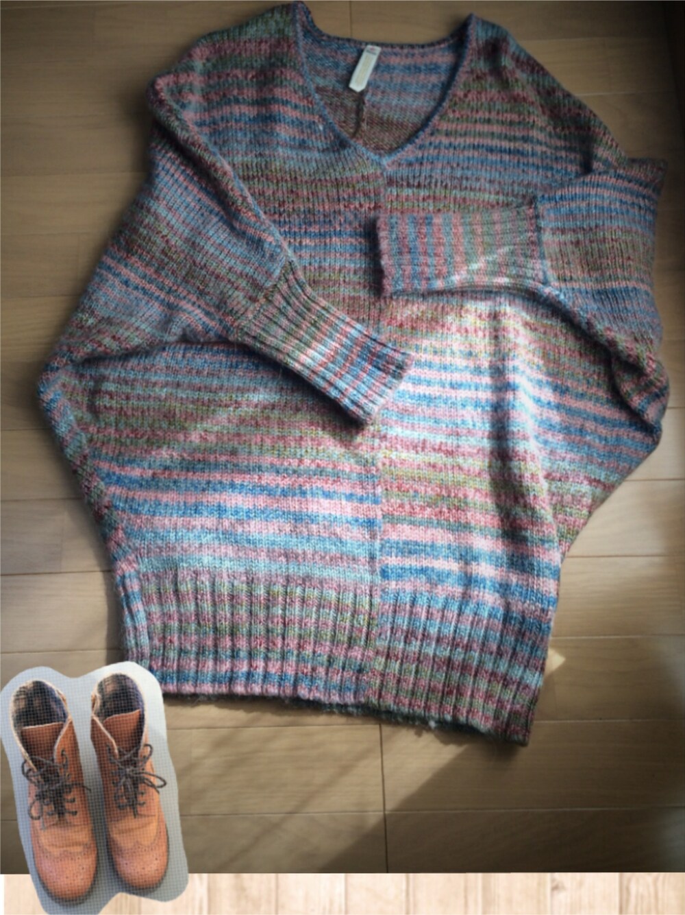 ブルー系のニット/セーターを着用したレディースの春コーディネートの1枚目の写真