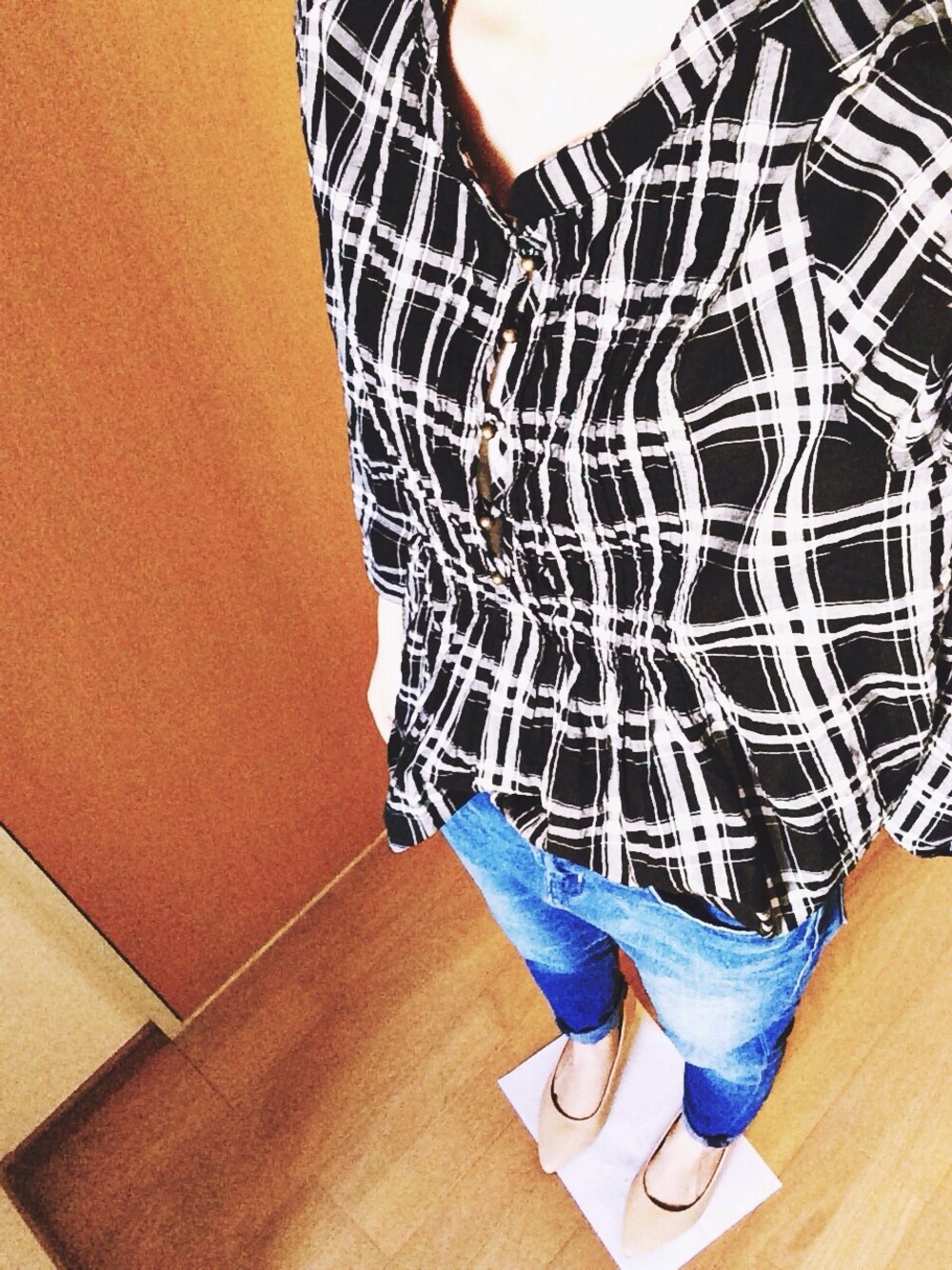 ブラック系のシャツ/ブラウスを着用したレディースの春コーディネートの1枚目の写真