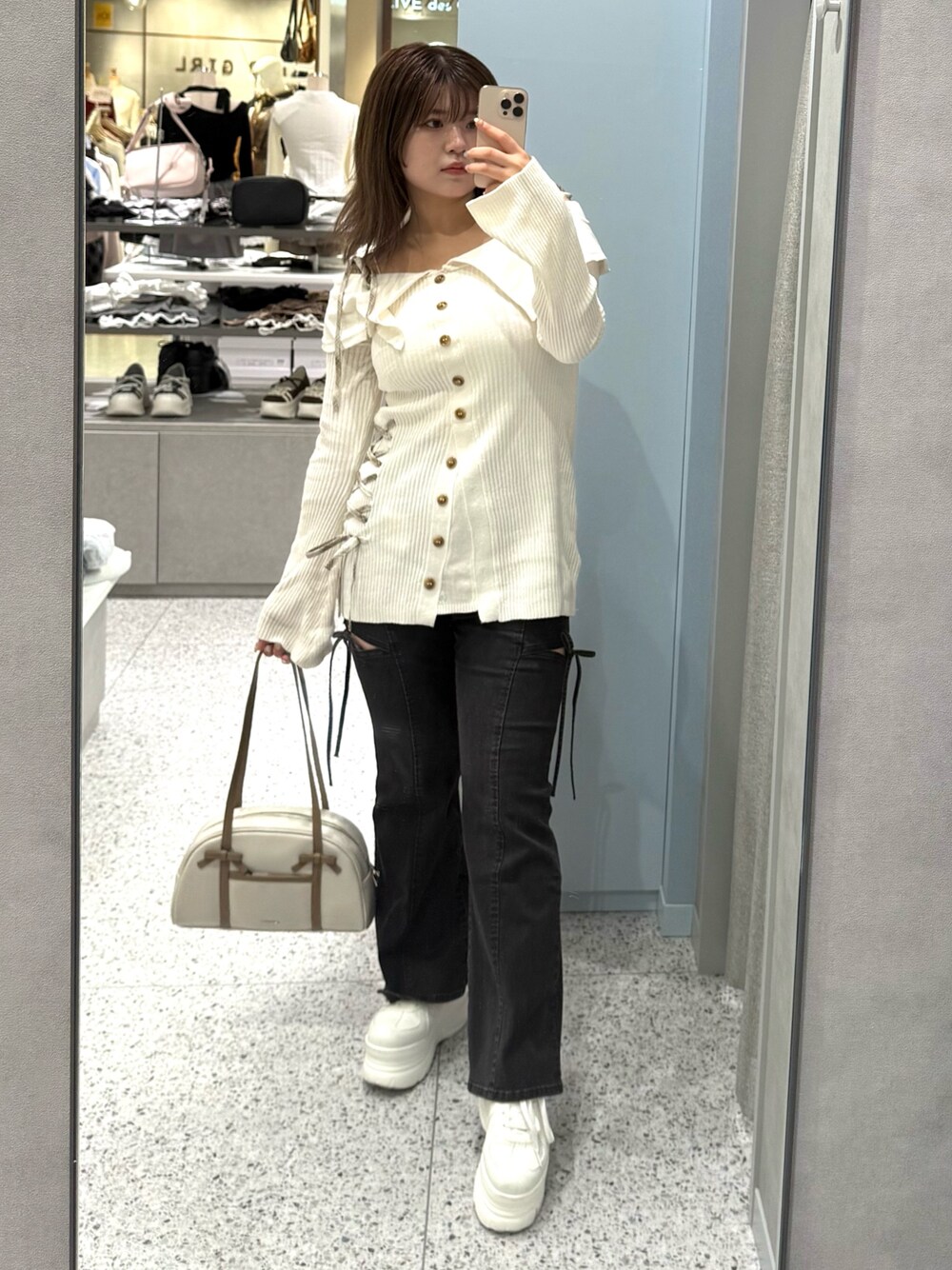aki(OLIVE des OLIVE 名古屋パルコ)のワンピース「【Belle Charme】レースアップオフショルニットワンピ」を使ったコーディネート