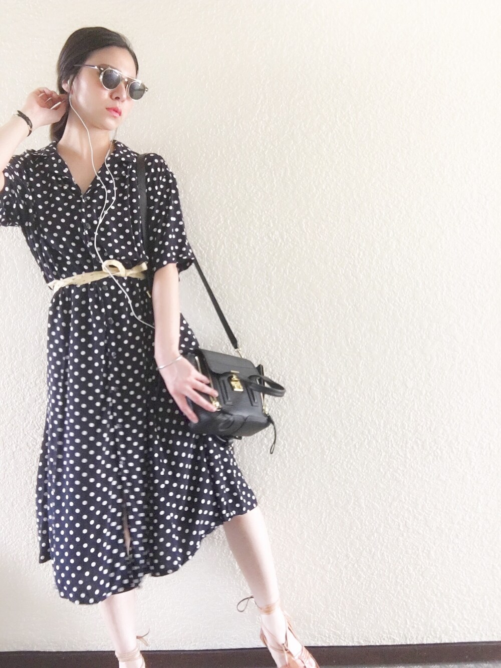 usedショップでGetした クラシカルなドットワンピース 肩落ちの大きめシルエットで 少し古臭く。