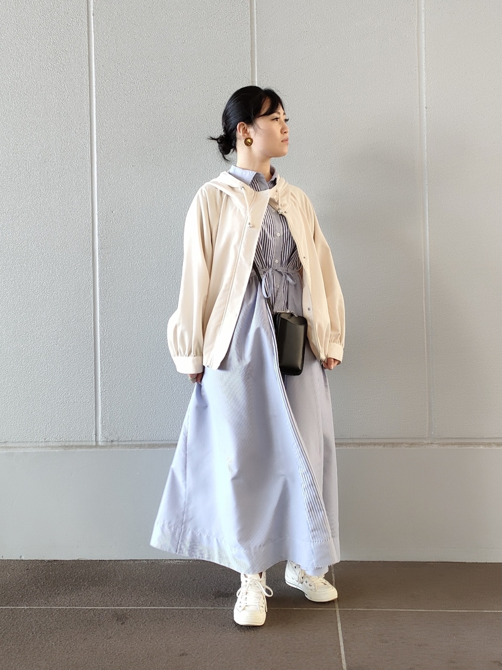 AKIのシャツワンピース「ストライプ切替シャツワンピース」を使ったコーディネート