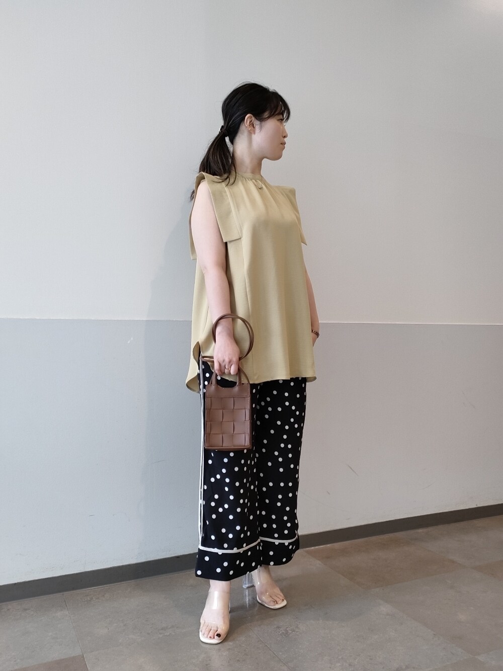 いつもご覧頂きありがとうございます😊✨ いいね&お気に入り登録、コメントをくださる方々、本当にありがとうございます😍✨ ドット柄のパイピングパンツで、カジュアルきれいめコーデ✨ ◎ポイント 二の腕がスッキリ見えるフリルブラウスでノースリーブに挑戦🤭✨ 配色パイピングがスッキリ見えな大人らしいドット柄のパンツをボトムスに、カジュアルきれいめに合わせてみました😌❣️ Instagramには別角度も掲載しておりますので、ぜひそちらもフォローお願い致します😊 最後までありがとうございました✨😊