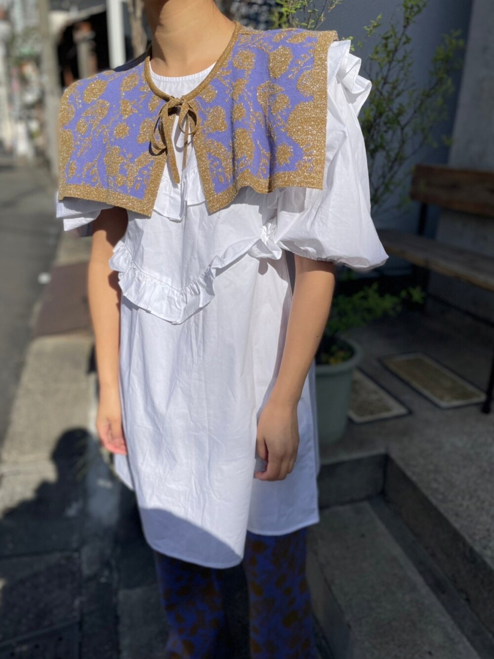 ブラウスにニットのつけ襟をレイヤードしたコーディネート❤️ ボトムにもつけ襟と同じ柄のボトムをレイヤードするのがオススメです❤️