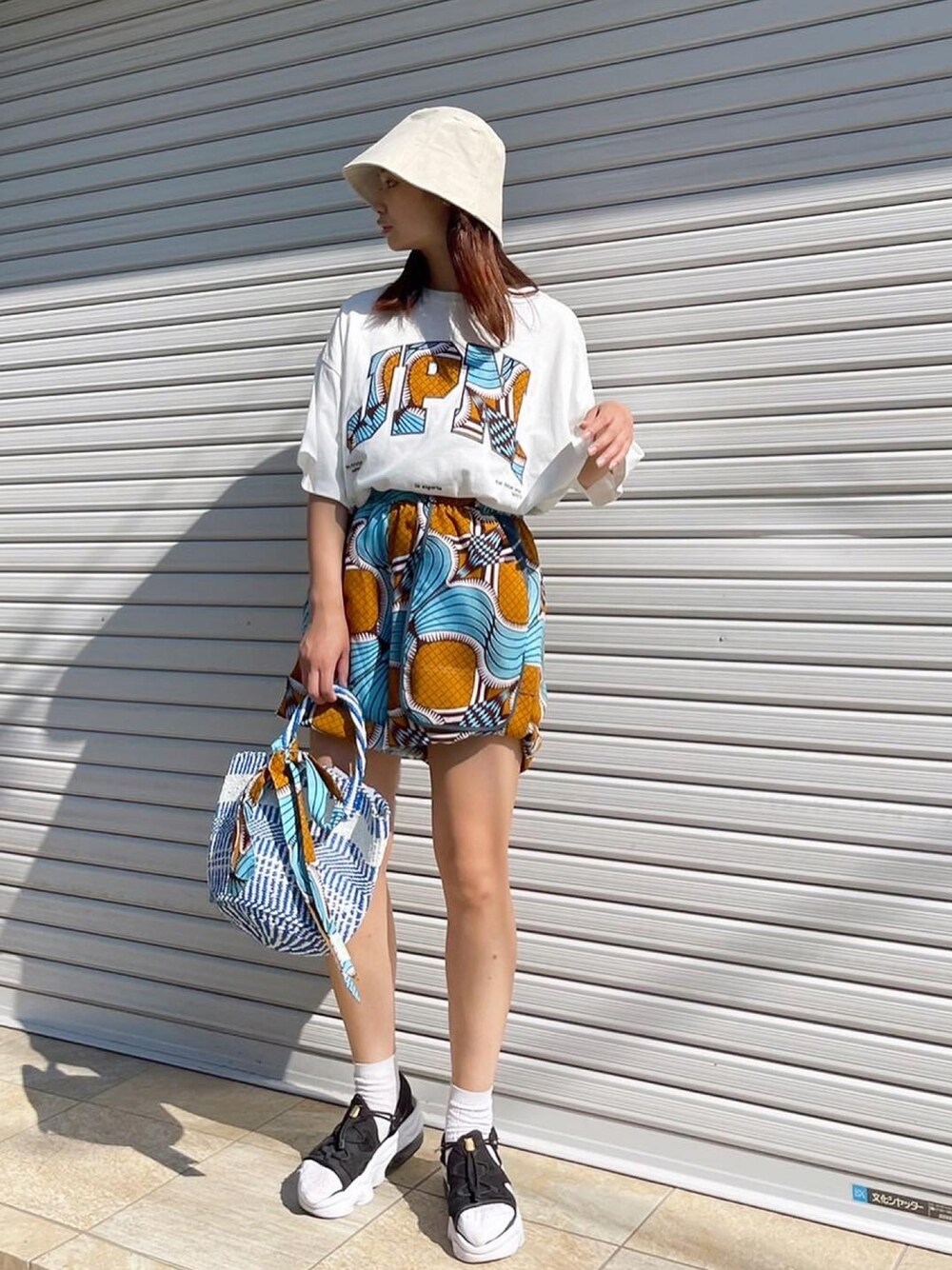 aki.moyanecriのTシャツ/カットソー「<moyan ecri>JPN パッチ刺繍ワンポイント オーバーサイズTシャツ【アフリカンファブリック】」を使ったコーディネート