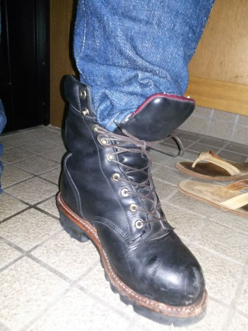 鬼デニムをチペワのロガーブーツにブーツインしました。 ブーツがかなりゴツいので、ブーツインでブーツを見せていくスタイル。