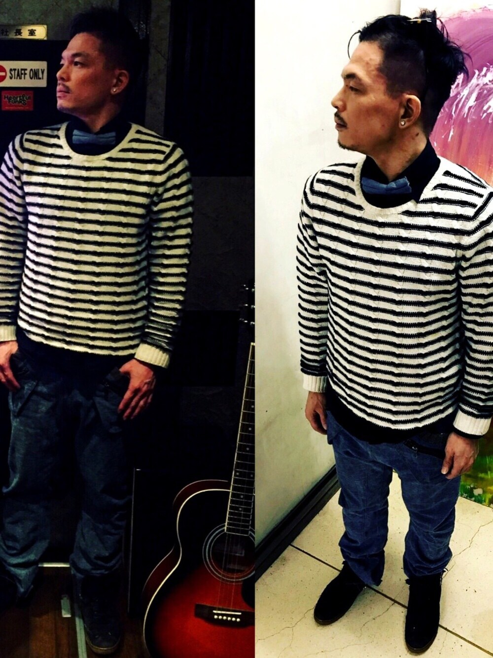 写真で分かりにくいけど 蝶ネクタイとパンツの色とを合わせたコーディネート 黒のシャツと セーターの黒のラインと靴の黒色と☆