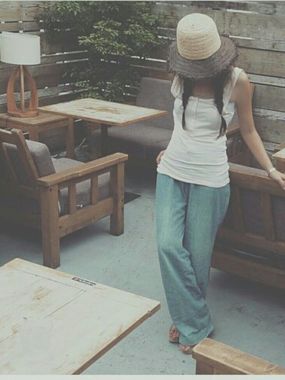 桜色のリブタンクにゆるゆるLevi'sのdenim