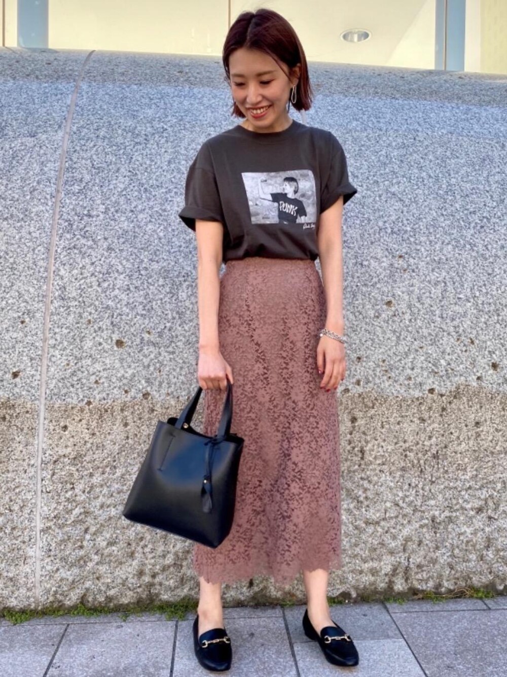 ミモレ丈の上品でキレイめな印象のレーススカートですが、グラフィックTシャツと合わせることでカジュアルダウンしました。トップス次第で様々な印象で着用いただけます。 スカート(サイズ38)トップス(サイズFree)
