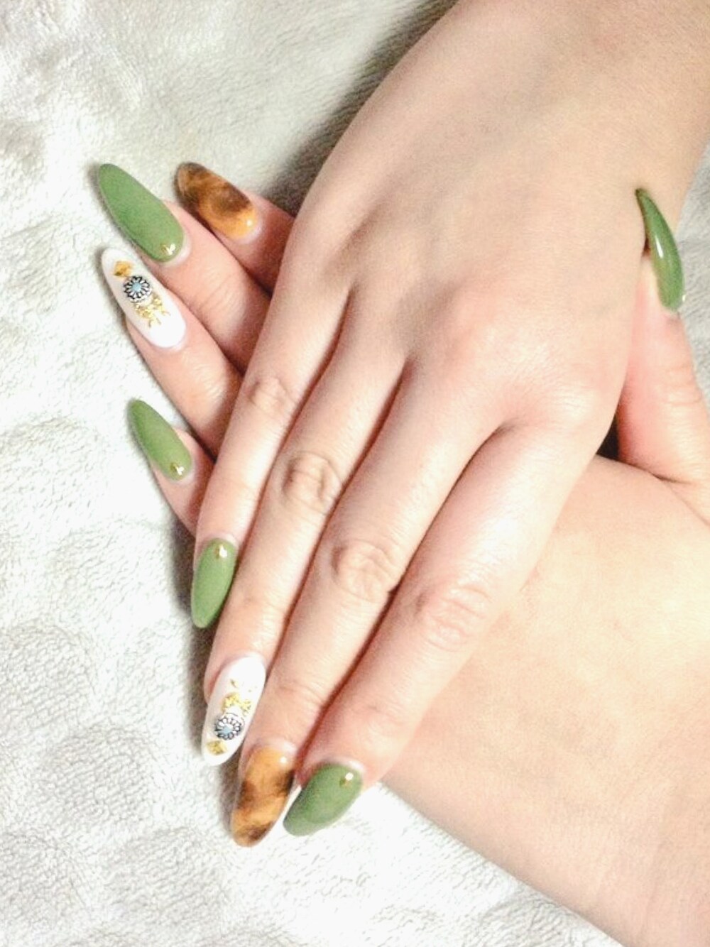 ちょっと伸びてるけど、ミリタリーMIX自爪ネイル。自爪が健やかに伸びる細長タイプなので自分の爪がおきにいり。