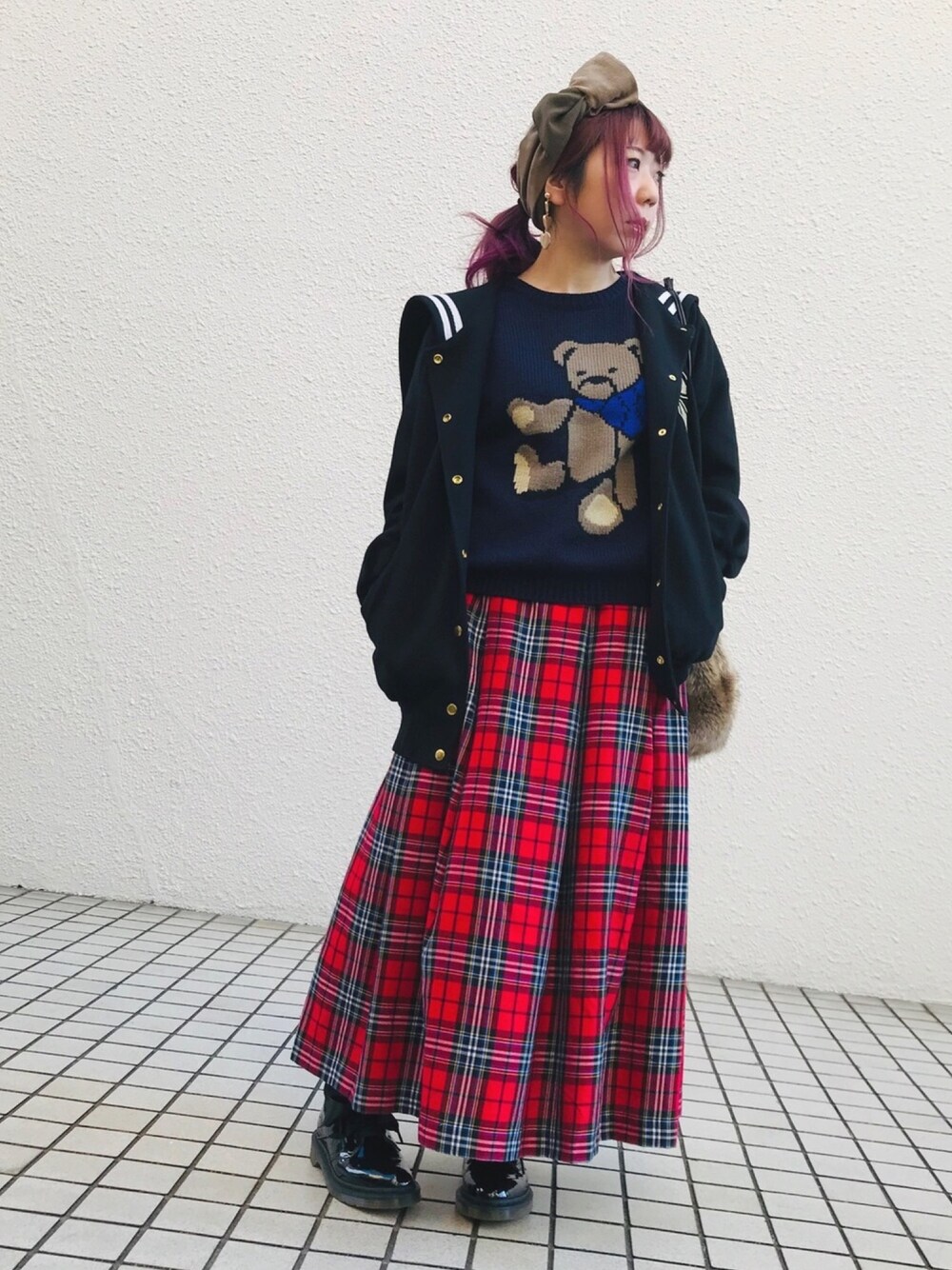くま柄と、チェックのボトムと、赤と黒の組み合わせ。 好きなテイストがもう何年も変わらなすぎる。 ブルゾンは数年前のワンスポ。 お気に入りすぎて毎年ヘビロテしてます。 そしてこのスカートの出現率!笑笑