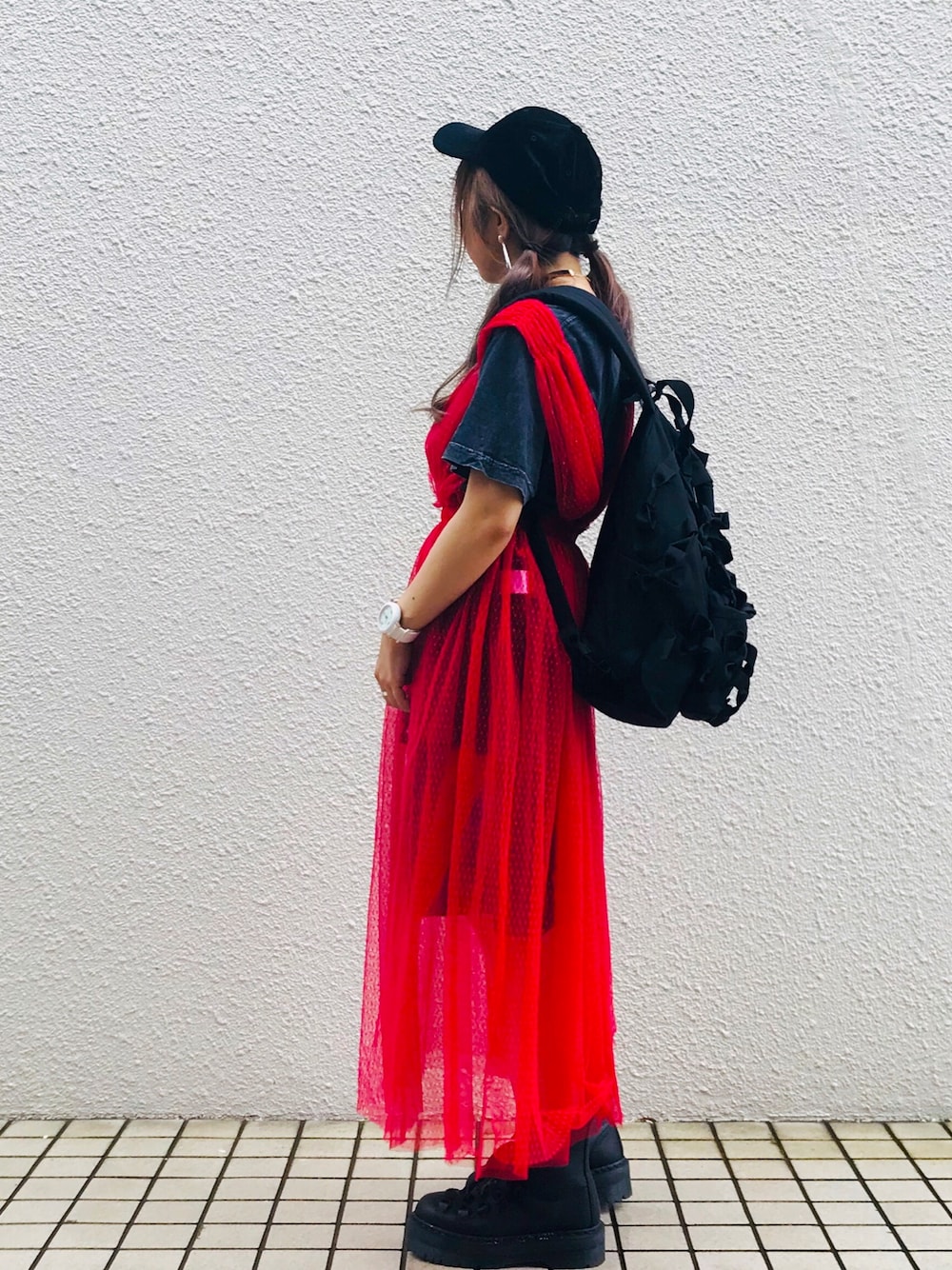 相変わらず赤い服を着ることが多いです。 バックパックはイーストパックのとビームスのコラボでリボンがいっぱい付いていてかわいいんです。