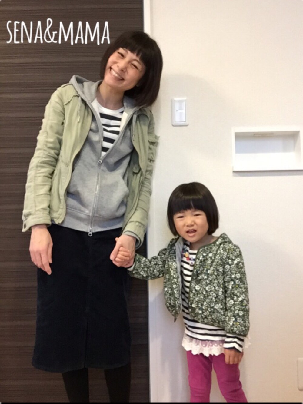 1/30土 ボーダー✖︎カーキouterでリンクコーデ♡ 「mamaもピンク履いて」って言われたけどピンクのpantsなんて持ってませーん(^^;;ピンクのtopsすら持ってませんよ〜〜 自分服は基本モノトーンだからな(ーー;)子どもにはカラフルなの着せたいけど、自分が着ないから合わせ方が分からないんだよなぁ……