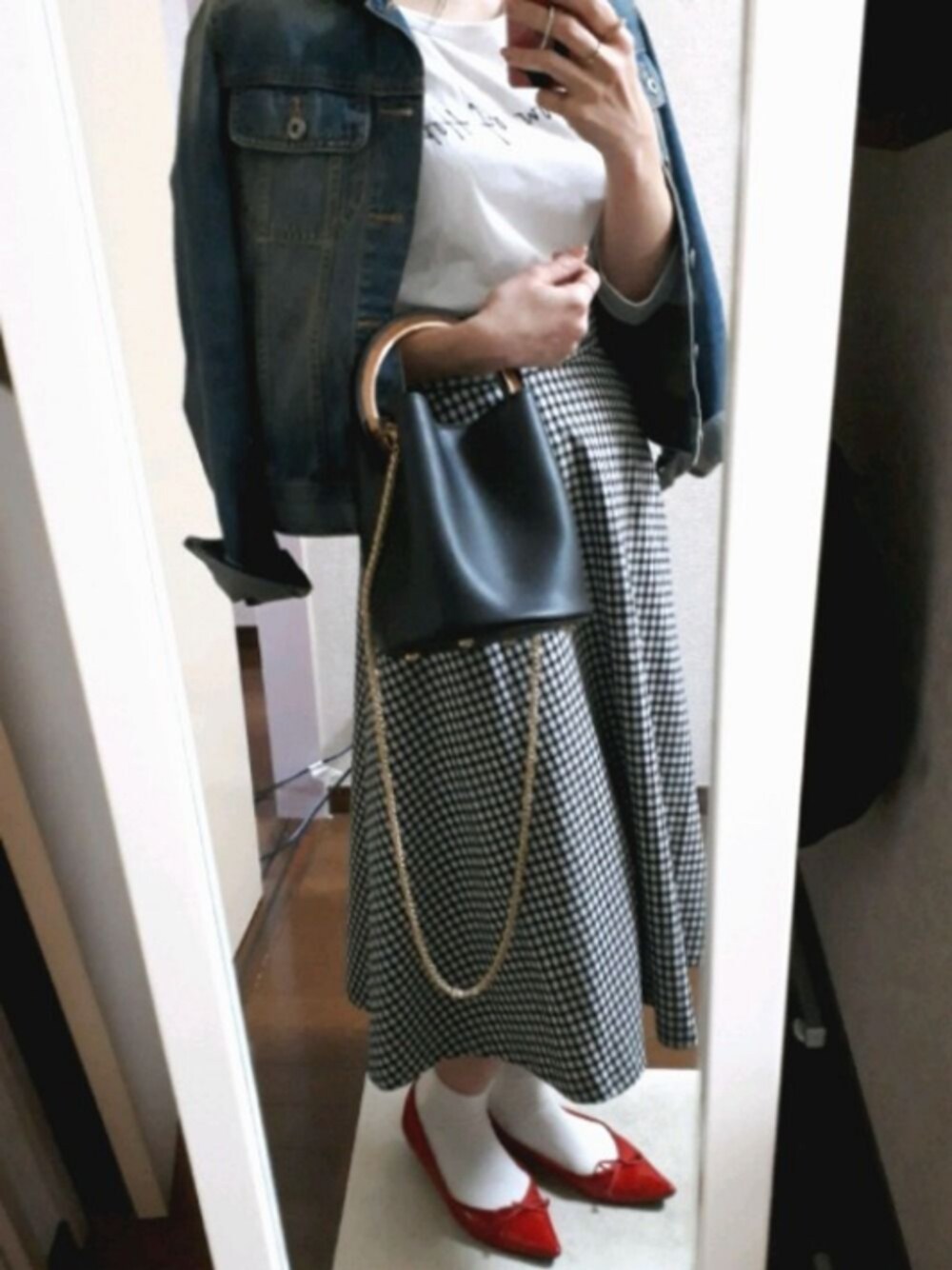 春コーデ🌸 デニムジャケットにギンガムチェックスカートで爽やかに〰赤パンプスをアクセントに👠✨ ウッドハンドルバッグがお気に入り🌟