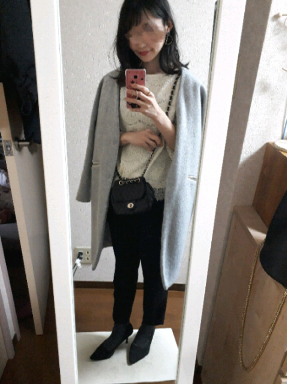 しまむら×guコーデ🎵 ノーカラーコートの形キレイでトップスはguのレースブラウスとヒール、チェーンバッグで大人可愛いコーデに💓