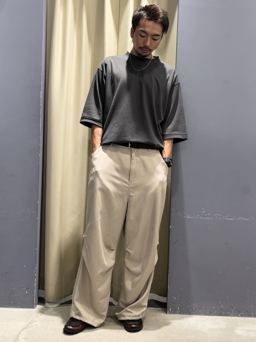 定番のビッグシルエットコーデ 幼く見えがちなロゴTも落ち着いた色味で合わせて大人っぽいコーディネートに。 ヴィンテージライクなロゴがアクセントになります。