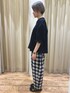 出勤コーデ🌿 襟レースの可愛いブラウスはブラックで甘さ控えめに😌 大柄のチェックがアクセントのパンツはガーゼ素材なので風通しよく、夏場まで重宝間違いなしです◎